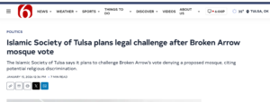 Broken Arrow said no to the mosque in Oklahoma. It is being challenged legally.